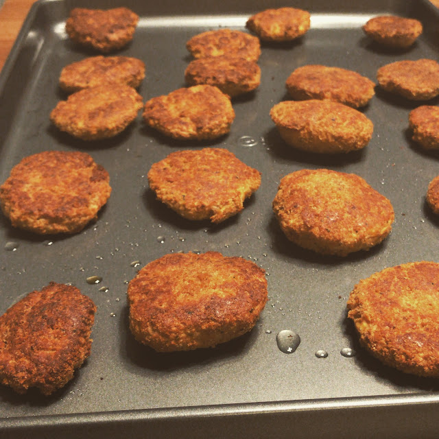 I also prepared roasted patties consisting of salmon, quinoa, carrots, and zucchini. It's a bit on the dry side so I typically paired it with moist dishes (e.g., creamed spinach and vegetable stew).